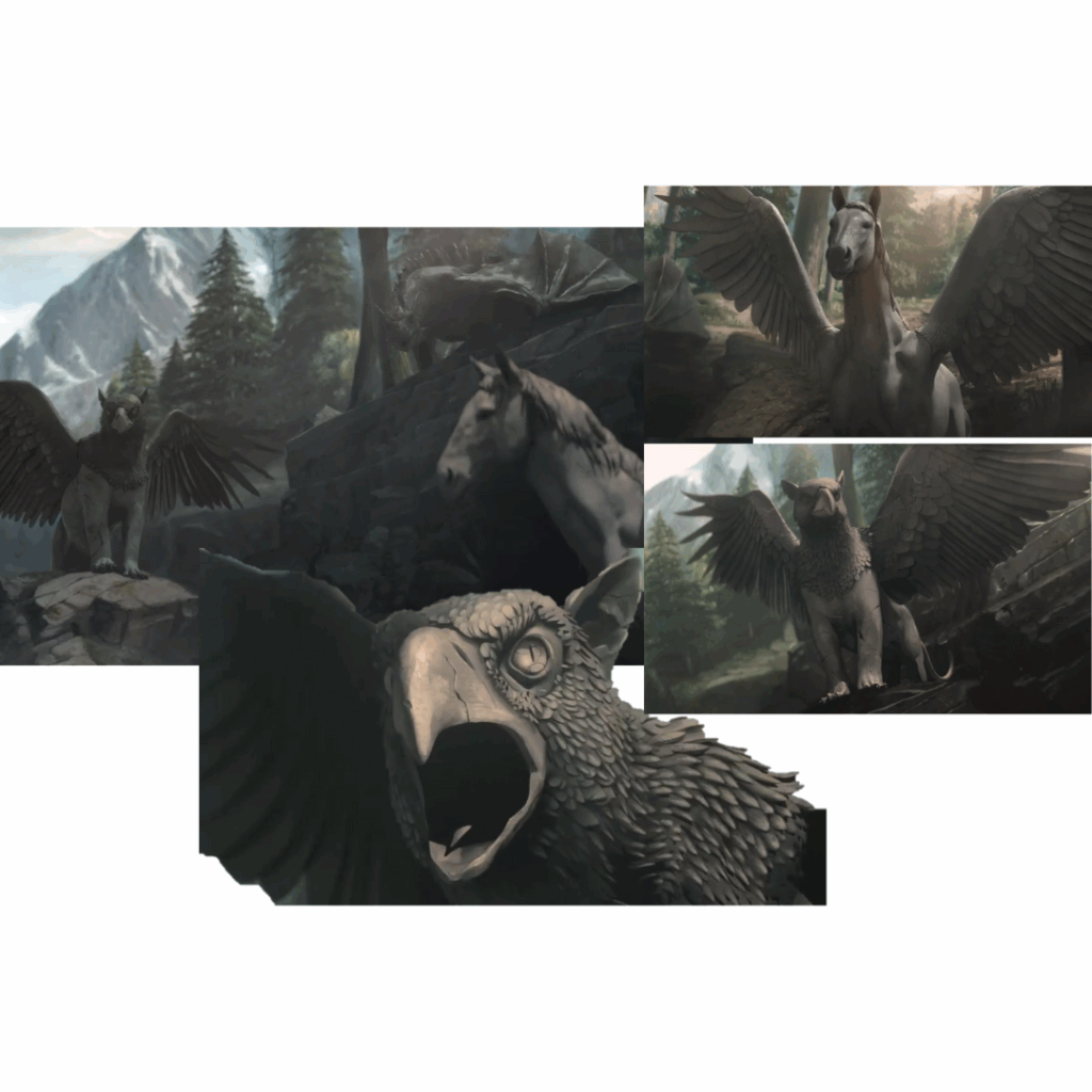 En el episodio “El sueño de mil gatos”, llevado a la pantalla a través de la animación, aparecen como guardianes de un punto de paso importante tres criaturas míticas: un dragón, un grifo, criatura con cabeza y alas de águila y cuerpo de león y Pegaso, un caballo alado nacido de la sangre de la gorgona Medusa tras su muerte.